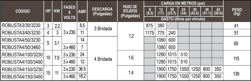 | ROBUSTA4/150/3460 | 15 | 3 X 460 | 4 BRIDADA |